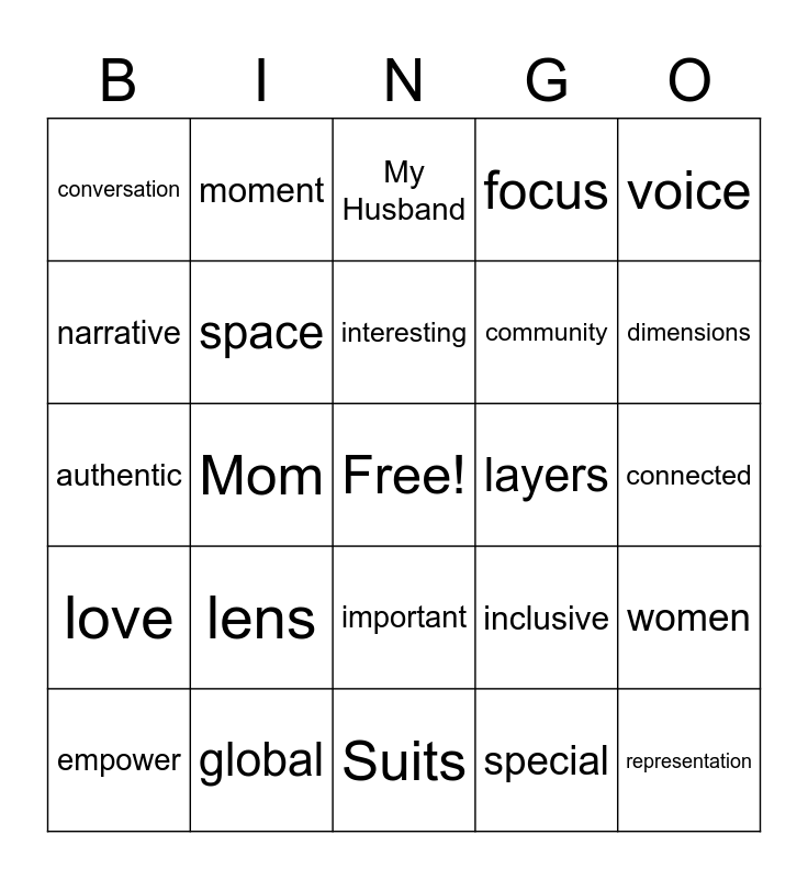 This bingo card has a free space and 24 words: lens, global, interesting, empower, voice, conversation, narrative, moment, layers, important, community, authentic, inclusive, women, space, special, connected, My Husband, dimensions, Mom, representation, love, focus and Suits.