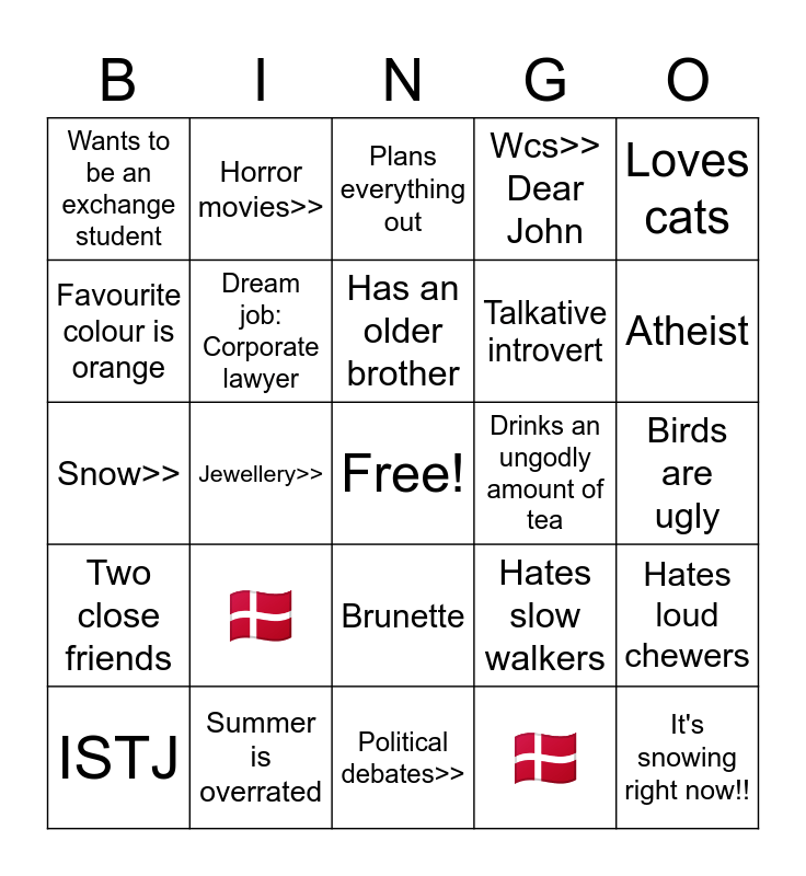 This bingo card has a free space and 25 words: π©π°, Political debates>>, Has an older brother, ISTJ, Loves cats, Wants to be an exchange student, Favourite colour is orange, Horror movies>>, Drinks an ungodly amount of tea, Brunette, Talkative introvert, Snow>>, Hates slow walkers, Hates loud chewers, Dream job: Corporate lawyer, Academic validation>> Male validation, Birds are ugly, Plans everything out, Atheist, Jewellery>>, It's snowing right now!!, Summer is overrated, Two close friends, Wcs>> Dear John and π©π°.