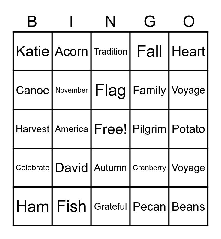 This bingo card has a free space and 24 words: David, Fish, Flag, Ham, Heart, Katie, Canoe, Acorn, Pilgrim, Autumn, Family, Harvest, Cranberry, Voyage, November, Pecan, Potato, Tradition, Voyage, America, Beans, Celebrate, Fall and Grateful.