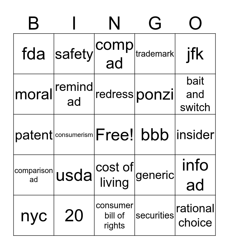 This bingo card has a free space and 24 words: usda, 20, redress, nyc, jfk, fda, moral, safety, bbb, cost of living, ponzi, patent, generic, info ad, remind ad, securities, insider, comp ad, bait and switch, consumerism, rational choice, comparison ad, trademark and consumer bill of rights.