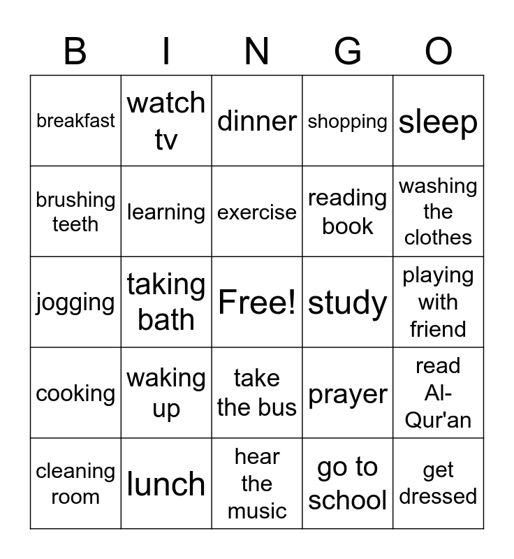 This bingo card has a free space and 24 words: waking up, lunch, exercise, cleaning room, sleep, breakfast, brushing teeth, watch tv, study, take the bus, reading book, jogging, prayer, read Al-Qur'an, learning, go to school, playing with friend, dinner, washing the clothes, taking bath, get dressed, cooking, shopping and hear the music.