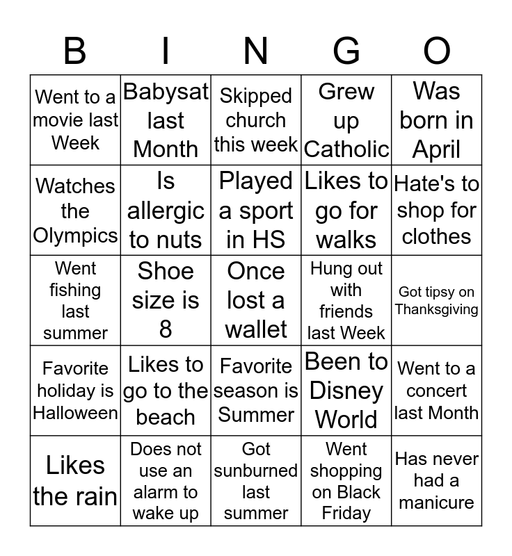 This bingo card has 25 words: Likes to go to the beach, Got sunburned last summer, Played a sport in HS, Likes the rain, Was born in April, Went to a movie last Week, Watches the Olympics, Babysat last Month, Hung out with friends last Week, Favorite season is Summer, Likes to go for walks, Went fishing last summer, Been to Disney World, Went to a concert last Month, Is allergic to nuts, Has never had a manicure, Got tipsy on Thanksgiving, Skipped church this week, Hate's to shop for clothes, Shoe size is 8, Once lost a wallet, Does not use an alarm to wake up, Favorite holiday is Halloween, Grew up Catholic and Went shopping on Black Friday.