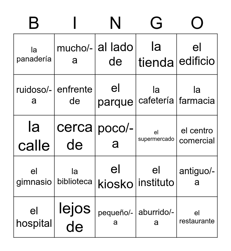 This bingo card has 25 words: la biblioteca, pequeño/-a, el parque, el hospital, el edificio, la panadería, ruidoso/-a, mucho/-a, el supermercado, el kiosko, la cafetería, la calle, el instituto, antiguo/-a, enfrente de, el restaurante, el centro comercial, al lado de, la farmacia, cerca de, poco/-a, lejos de, el gimnasio, la tienda and aburrido/-a.