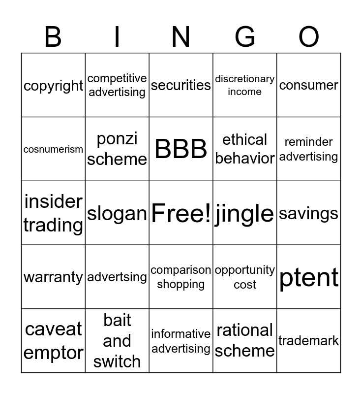 This bingo card has a free space and 24 words: advertsing, bait and switch, BBB, caveat emptor, consumer, copyright, cosnumerism, competitive advertising, jingle, comparison shopping, ethical behavior, insider trading, opportunity cost, ptent, ponzi scheme, rational scheme, savings, securities, reminder advertising, slogan, trademark, warranty, discretionary income and informative advertising.