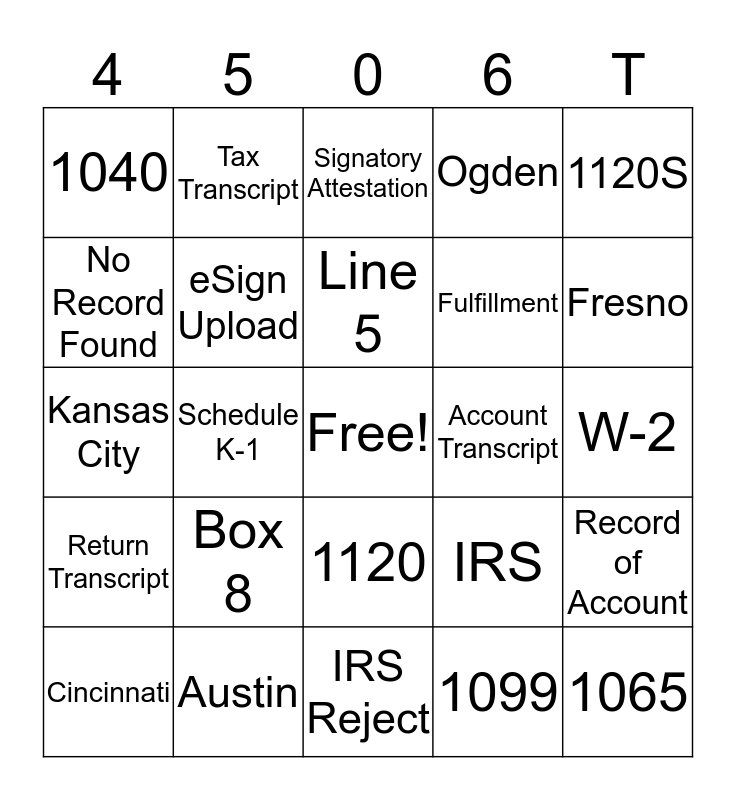This bingo card has a free space and 27 words: IRS, Consent Form, Fulfillment, IRS Reject, No Record Found, Signatory Attestation, Tax Transcript, Return Transcript, Account Transcript, Record of Account, Kansas City, Ogden, Cincinnati, Austin, Fresno, eSign Capture, eSign Upload, Line 5, Box 8, 1040, W-2, 1099, Schedule K-1, 1065, 1120, 1120S and 990.