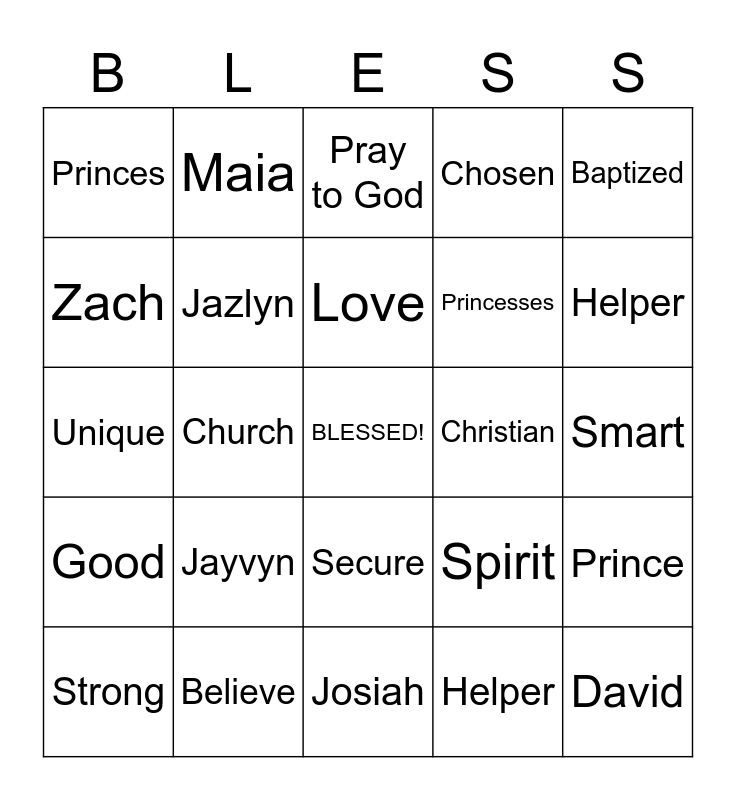 This bingo card has a free space and 52 words: Mary, David, Monte, Josiah, Jayvyn, Anya, Maia, Jacquari, Zach, Gigi, Jazlyn, Braden, Prince, Spirit, God, Jesus, Love, Christian, Blessing, Baptized, Church, Helper, Princes, Princesses, Special, Wonderful, Loved, Smart, Helper, Obey Parents, Blessed, Chosen, Cousins, Committed, Love God, Pray to God, Believe, Young Man, Young Woman, Strong, Able, Smart, Good, Loved, Secure, Studies, Purposed, Unique, Gifted, Talented, Strong and Able.