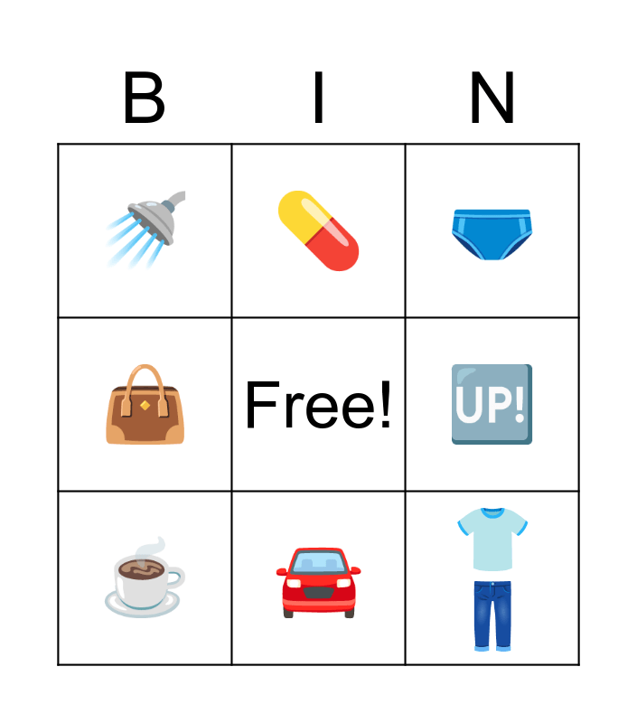 This bingo card has a free space and 8 words: 🆙, 🩲, 💊, ☕️, 🚿, 👕👖, 👜 and 🚘.