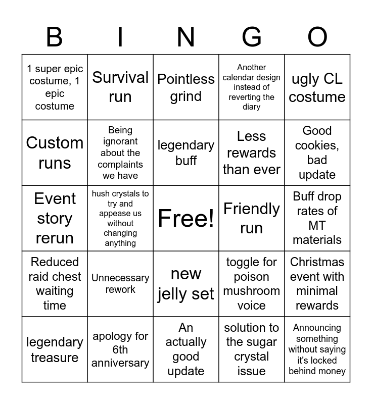 This bingo card has a free space and 24 words: Unnecessary rework, apology for 6th anniversary, legendary buff, legendary treasure, ugly CL costume, 1 super epic costume, 1 epic costume, Custom runs, Survival run, Friendly run, new jelly set, Less rewards than ever, Event story rerun, toggle for poison mushroom voice, Christmas event with minimal rewards, Being ignorant about the complaints we have, solution to the sugar crystal issue, Buff drop rates of MT materials, Pointless grind, Good cookies, bad update, hush crystals to try and appease us without changing anything, Announcing something without saying it's locked behind money, Reduced raid chest waiting time, Another calendar design instead of reverting the diary and An actually good update.