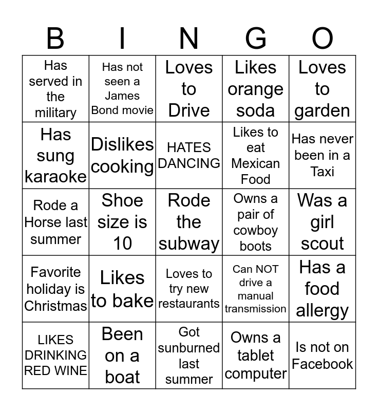 This bingo card has 25 words: Likes to bake, Got sunburned last summer, HATES DANCING, LIKES DRINKING RED WINE, Loves to garden, Has served in the military, Has sung karaoke, Has not seen a James Bond movie, Owns a pair of cowboy boots, Loves to try new restaurants, Likes to eat Mexican Food, Rode a Horse last summer, Can NOT drive a manual transmission, Has a food allergy, Dislikes cooking, Is not on Facebook, Was a girl scout, Loves to Drive, Has never been in a Taxi, Shoe size is 10, Rode the subway, Been on a boat, Favorite holiday is Christmas, Likes orange soda and Owns a tablet computer.