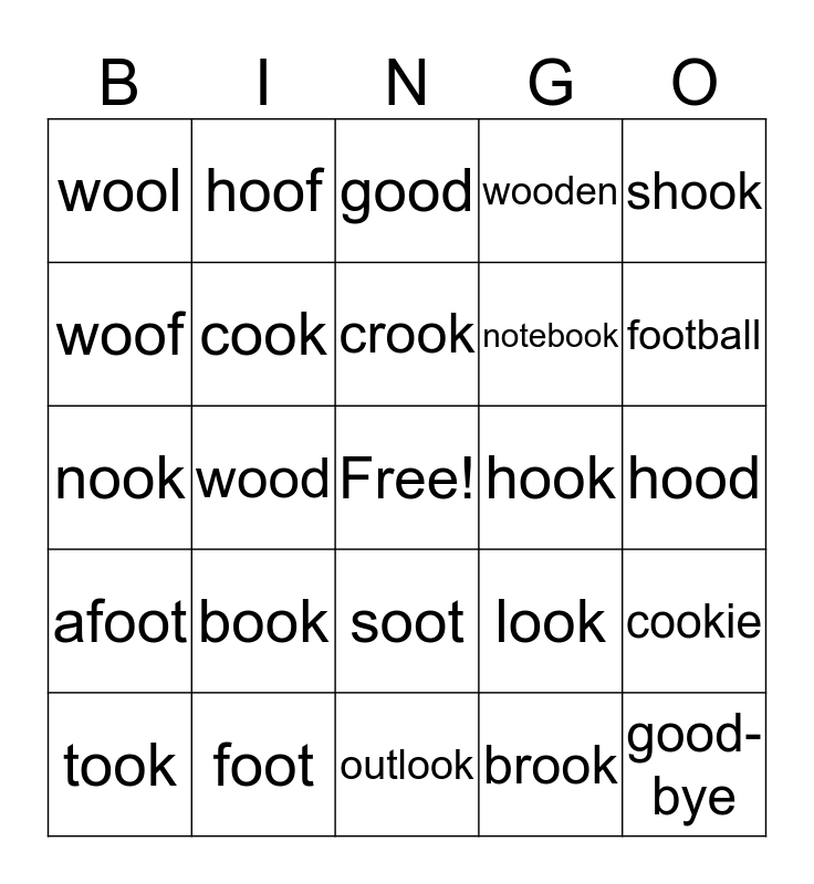 This bingo card has a free space and 24 words: book, foot, crook, took, shook, wool, woof, hoof, hook, soot, notebook, nook, look, cookie, cook, brook, hood, good, football, wood, good-bye, afoot, wooden and outlook.