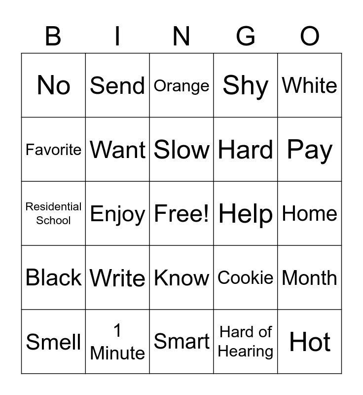 This bingo card has a free space and 24 words: Write, 1 Minute, Slow, Smell, White, No, Favorite, Send, Help, Know, Hard, Residential School, Cookie, Month, Want, Hard of Hearing, Home, Orange, Pay, Enjoy, Hot, Black, Shy and Smart.