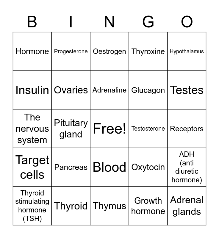 This bingo card has a free space and 28 words: ADH (anti diuretic hormone), Endocrine System, Glucagon, Growth hormone, Insulin, Oestrogen, Progesterone, Target cells, Testosterone, Thyroid stimulating hormone (TSH), The nervous system, Thyroxine, Thyroid, Thymus, Testes, Parathyroid, Pancreas, Ovaries, Adrenaline, Blood, Hormone, Negative feedback, Adrenal glands, Pituitary gland, Receptors, Oxytocin, Hypothalamus and Melatonin.