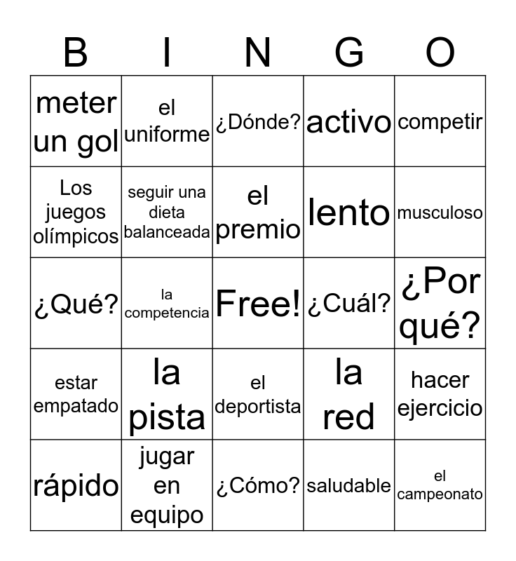 This bingo card has a free space and 24 words: la pista, jugar en equipo, el premio, rápido, competir, meter un gol, Los juegos olímpicos, el uniforme, ¿Cuál?, el deportista, lento, ¿Qué?, la red, hacer ejercicio, seguir una dieta balanceada, saludable, ¿Por qué?, ¿Dónde?, musculoso, la competencia, el campeonato, estar empatado, activo and ¿Cómo?.