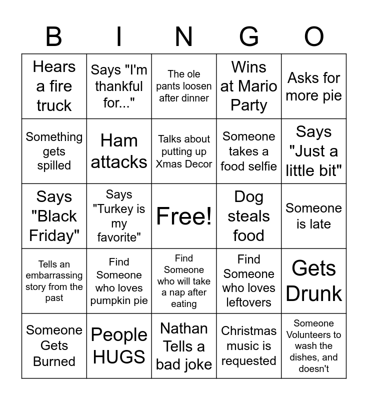 This bingo card has a free space and 24 words: Find Someone who loves pumpkin pie, People HUGS, Talks about putting up Xmas Decor, Someone Gets Burned, Asks for more pie, Hears a fire truck, Something gets spilled, Says "I'm thankful for...", Dog steals food, Find Someone who will take a nap after eating, Someone takes a food selfie, Says "Black Friday", Find Someone who loves leftovers, Gets Drunk, Ham attacks, Christmas music is requested, Someone is late, The ole pants loosen after dinner, Says "Just a little bit", Says "Turkey is my favorite", Someone Volunteers to wash the dishes, and doesn't, Tells an embarrassing story from the past, Wins at Mario Party and Nathan Tells a bad joke.