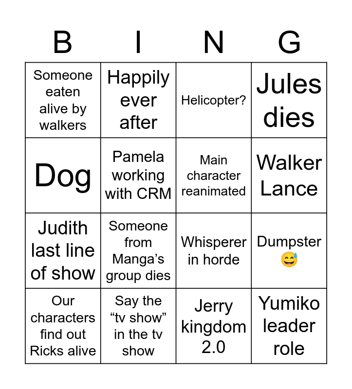 This bingo card has 16 words: Say the “tv show” in the tv show, Dumpster 😅, Helicopter?, Someone eaten alive by walkers, Judith last line of show, Happily ever after, Whisperer in horde, Jerry kingdom 2.0, Dog, Pamela working with CRM, Our characters find out Ricks alive, Jules dies, Someone from Manga’s group dies, Walker Lance, Main character reanimated and Yumiko leader role.