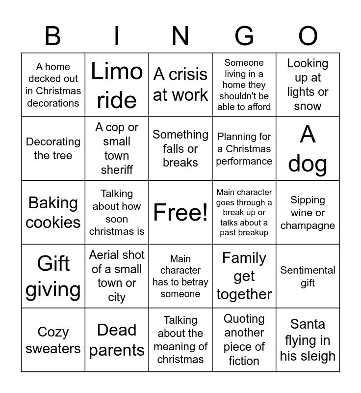 This bingo card has a free space and 100 words: Love triangle, Childhood friends, Sipping wine or champagne, Main character has to do something they haven't done in years, Santa, Playing in the snow, Gifting jewelry, Bringing flowers, Love interests walking through the snow, Hanging stockings, Making something handmade, Talking about deceased loved ones, Cant be home for Christmas, Dead parents, Reviving old Christmas traditions, Starting new Christmas traditions, Planning for a Christmas performance, Traveling, Main character hasn't been home in a while, Ex-Boyfriend or current boyfriend shows up, A doctor, A lawyer, A farm boy, Looking at family photos, Women talking about the love interest, Main character goes through a break up or talks about a past breakup, Looking up at lights or snow, Family get together, An almost kiss, Main character is amazing at ____, Talking about how soon christmas is, A home decked out in Christmas decorations, Costumes, Character is a scrooge, Quoting another piece of fiction, Something falls or breaks, Sentimental gift, Eating a candy cane, Character can't sleep, Making or drinking hot chocolate, Getting lost, Main character can't stay long, Baking cookies, A concerned relative, A dog, A crisis at work, Something magical happens, Shopping for a Christmas tree, A Christmas party, Talking about the meaning of christmas, A wreath, Eggnog, Child singing, Talking about a big city, A sleigh or carriage ride, Single parent, Amnesia, Christmas sweaters, Small town restaurant, Someone living in a home they shouldn't be able to afford, Doing something nice for others, Ice skating, An awkward situation, A small town business in trouble, Journalists or a camera crew, Decorating something already decorated, A contest, Someone doesn't understand the situation, Mistletoe, Sharing holiday memories, Someone encouraging a relationship, Aerial shot of a small town or city, Actors who have been in many holiday movies, Stressing about work, A tree lighting, Random crafty skills, Running to catch up or meet someone, Decorating the tree, We can't be together, Someone wearing flannel, A cooking mistake, Santa flying in his sleigh, Weather interferes with plans, Main character has to betray someone, Someone drives a truck, Limo ride, A castle or mansion, Hiding from someone else, Small town coffee shop, Gift giving, I've lived in _____ my whole life, Main character or love interest is rich, Flashback, Cozy sweaters, A cop or small town sheriff, Main character comes back, Small town, Parents or relatives asking intrusive questions, "we're just friends" and A Christmas wedding or proposal.