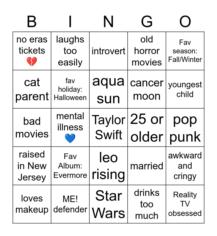 This bingo card has a free space and 24 words: Fav Album: Evermore, ME! defender, aqua sun, loves makeup, Fav season: Fall/Winter, no eras tickets💔, cat parent, laughs too easily, 25 or older, leo rising, cancer moon, bad movies, married, awkward and cringy, fav holiday: Halloween, drinks too much, pop punk, introvert, youngest child, mental illness💙, Reality TV obsessed, raised in New Jersey, old horror movies and Star Wars.