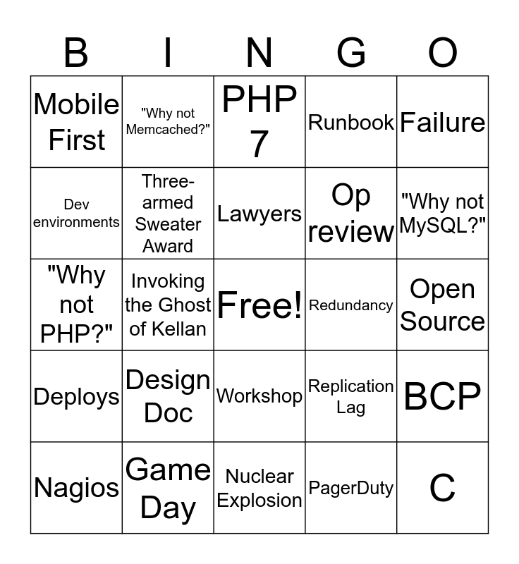 This bingo card has a free space and 44 words: Go, C, C++, Nagios, Graphs, PagerDuty, PHP 7, HHVM, Failure, Game Day, Runbook, Redundancy, Workshop, Design Doc, CAP Theorem, Nuclear Explosion, Hurricane Sandy, "Why not PHP?", "Why not Redis?", "Why not MySQL?", "Why not Memcached?", Capacity Planning, Member Ops, Mobile First, Mobile Web, Open Source, Bus Factor, Backfill, Replication Lag, Deploys, Edge, BCP, Gearman, Christmas Day, Invoking the Ghost of Kellan, Unknown Unknowns, Hard Questions, Slush, Lawyers, Dev environments, Op review, Forkistan, Three-armed Sweater Award and AWS.