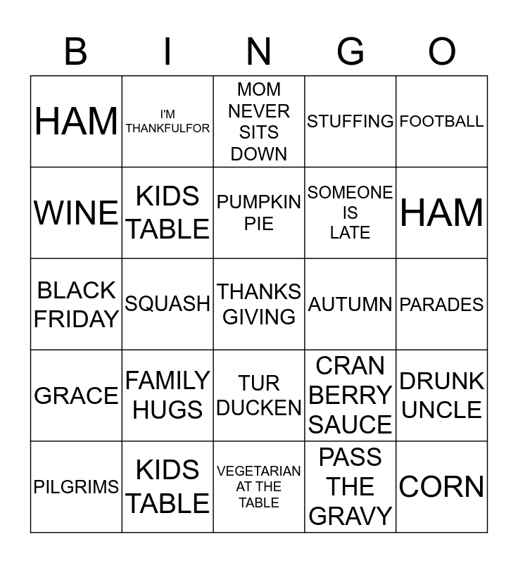 This bingo card has a free space and 24 words: FAMILY HUGS, KIDS TABLE, PUMPKIN PIE, PILGRIMS, FOOTBALL, HAM, WINE, I'M THANKFULFOR, AUTUMN, TUR DUCKEN, SOMEONE IS LATE, BLACK FRIDAY, CRAN BERRY SAUCE, DRUNK UNCLE, KIDS TABLE, PASS THE GRAVY, PARADES, MOM NEVER SITS DOWN, HAM, SQUASH, CORN, GRACE, STUFFING and VEGETARIAN AT THE TABLE.
