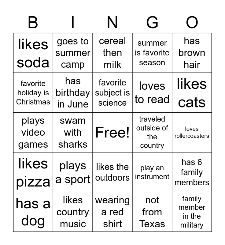 This bingo card has a free space and 25 words: plays a sport, wearing a red shirt, favorite subject is science, has a dog, has brown hair, likes soda, favorite holiday is Christmas, goes to summer camp, traveled outside of the country, likes the outdoors, loves to read, plays video games, play an instrument, has 6 family members, has birthday in June, can touch their tongue to their nose, loves rollercoasters, cereal then milk, likes cats, swam with sharks, family member in the military, likes country music, likes pizza, summer is favorite season and not from Texas.