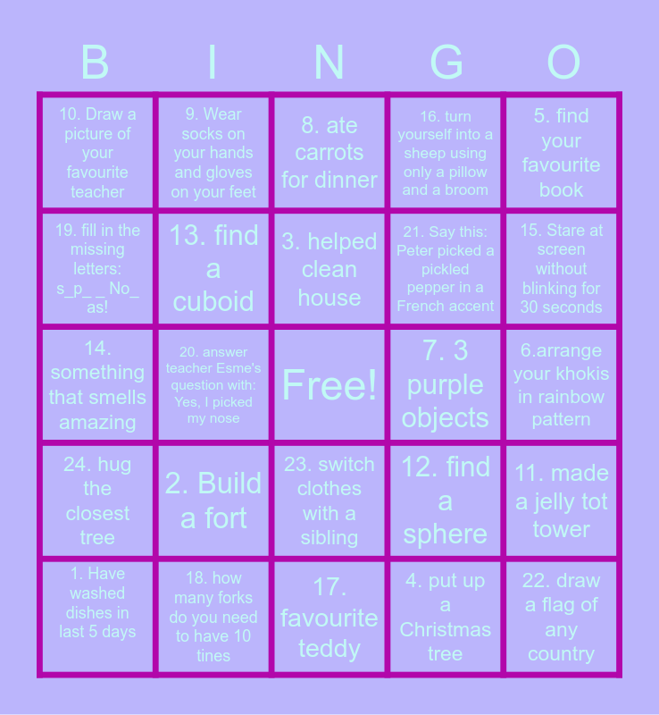 This bingo card has a free space and 24 words: 1. Have washed dishes in last 5 days, 2. Build a fort, 3. helped clean house, 4. put up a Christmas tree, 5. find your favourite book, 10. Draw a picture of your favourite teacher, 9. Wear socks on your hands and gloves on your feet, 8. ate carrots for dinner, 7. 3 purple objects, 6.arrange your khokis in rainbow pattern, 14. something that smells amazing, 13. find a cuboid, 12. find a sphere, 11. made a jelly tot tower, 19. fill in the missing letters: s_p_ _ No_ as!, 18. how many forks do you need to have 10 tines, 17. favourite teddy, 16. turn yourself into a sheep using only a pillow and a broom, 15. Stare at screen without blinking for 30 seconds, 24. hug the closest tree, 20. answer teacher Esme's question with: Yes, I picked my nose, 23. switch clothes with a sibling, 21. Say this: Peter picked a pickled pepper in a French accent and 22. draw a flag of any country.