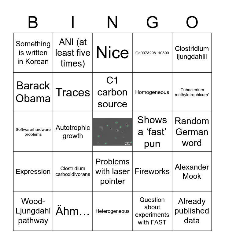 This bingo card has a free space and 24 words: Clostridium carboxidivorans, Ähm…, C1 carbon source, Wood-Ljungdahl pathway, Clostridium ljungdahlii, Something is written in Korean, Barack Obama, ANI (at least five times), Shows a ‘fast’ pun, Problems with laser pointer, Homogeneous, Software/hardware problems, Fireworks, Alexander Mook, Traces, Question about experiments with FAST, Random German word, Nice, ‘Eubacterium methylotrophicum’, Autotrophic growth, Already published data, Expression, Ga0073298_10390 and Heterogeneous.