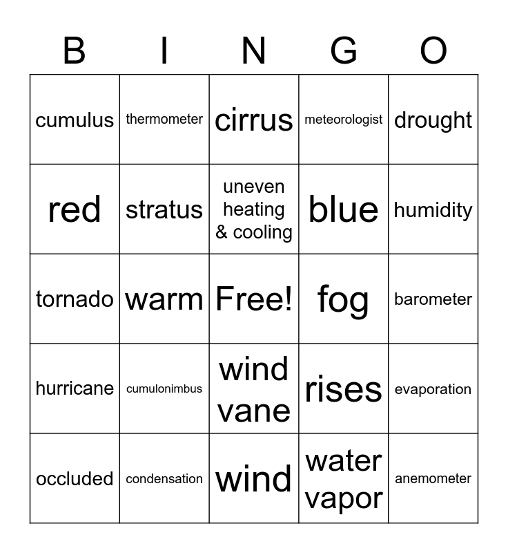 This bingo card has a free space and 29 words: occluded, cold, warm, stationary, cumulus, cirrus, stratus, cumulonimbus, fog, condensation, barometer, anemometer, wind, water vapor, humidity, hygrometer, wind vane, hurricane, drought, tornado, rises, sinks, blue, red, meteorologist, thermometer, evaporation, uneven heating & cooling and troposphere.