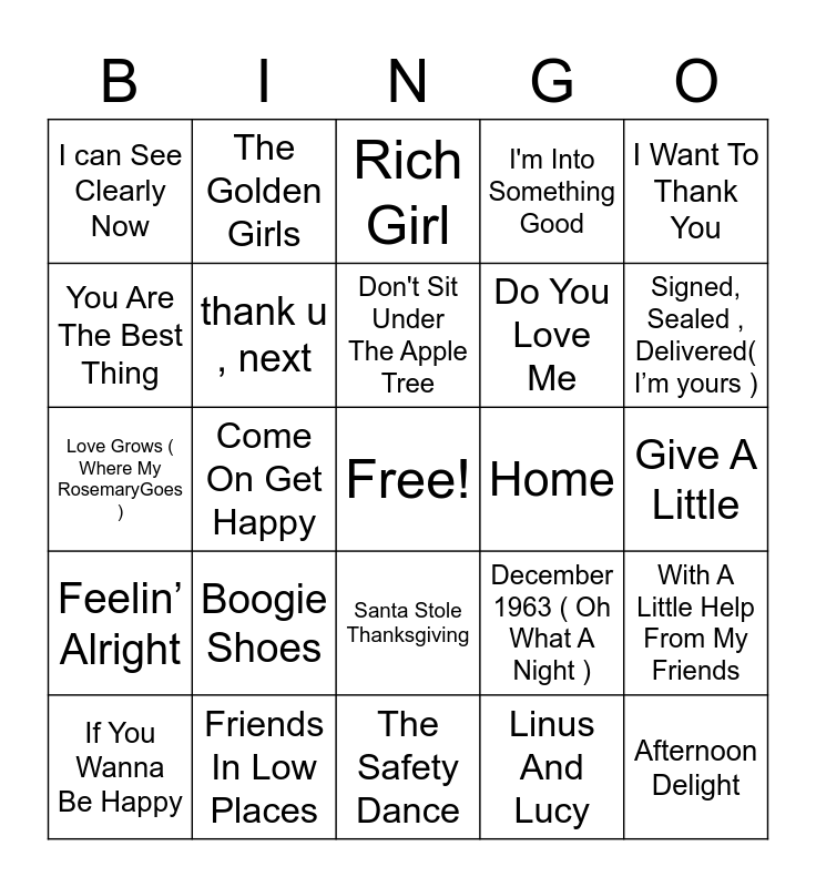 This bingo card has a free space and 67 words: GREENS BEANS POTATOES, ( Do THe) Mashed Potatoes, Thanksgiving Theme, With A Little Help From My Friends, Apple, Peaches , Pumpkin Pie, Cheeseburger In Paradise, The Golden Girls, We Are Family, Don't Sit Under The Apple Tree, Lets Turkey Trot, Santa Stole Thanksgiving, What A Wonderful World, Give A Little, I Want To Thank You, Memories, You Are The Best Thing, Come On Get Happy, I can See Clearly Now, Good Day Sunshine, Do You Love Me, Boogie Shoes, Feelin’ Alright, I'm Into Something Good, Linus And Lucy, Me And Julio DOwn By The Schoolyard, I Got You Babe, Kokomo, Cecilia, Signed, Sealed , Delivered( I’m yours ), You Make My Dreams ( Come Trues), Afternoon Delight, Lean On Me, Ain't No Mountain High Enough, Wouldn't It Be Nice, Where Everybody Knows Your Name, If You Wanna Be Happy, Stretchy Pants, December 1963 ( Oh What A Night ), Love Grows ( Where My RosemaryGoes ), I Feel The Earth Move, I'll Be There For You, thank u , next, Home, Turkey Chase, Lovely Day, Youre My Best Friend, Count on Me, Friends In Low Places, Photograph, Bring It On Home to Me, Rich Girl, Thank you ( Falettinme Be Mice Elf Agin), Every Breath You Take, Fly Me To The Moon, For Once In My Life, The Safety Dance, Cake By The Ocean, Jumpin’ Jack Flash, Escape ( The Pina Colada Song ), American Pie, Born To Run, Maybelline, Gratitude, Piano Man, Best Of My Love, Got To Get You Into My Life and Where You Lead.