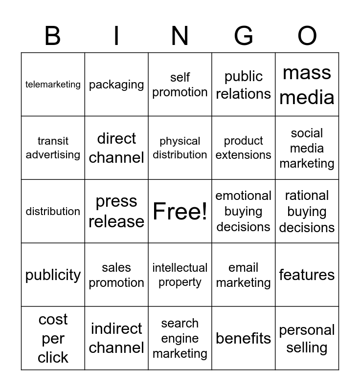 This bingo card has a free space and 40 words: supply chain management, distribution, channels of distribution, direct channel, indirect channel, intellectual property, physical distribution, advertising, mass media, publicity, press release, public relations, personal selling, rational buying decisions, emotional buying decisions, sales promotion, rebate, telemarketing, visual marketing, self promotion, features, benefits, product extensions, transit advertising, outdoor advertising, radio advertising, newspaper advertising, direct mail advertising, magazine advertising, television advertising, cost per mile, cost per click, cost per action, email marketing, social media marketing, search engine marketing, display advertising, rich media ads, packaging and four basic options of channels of distribution.