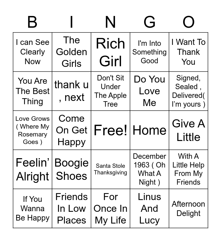This bingo card has a free space and 67 words: GREENS BEANS POTATOES, ( Do The) Mashed Potatoes, Thanksgiving Theme, With A Little Help From My Friends, Apple, Peaches , Pumpkin Pie, Cheeseburger In Paradise, The Golden Girls, We Are Family, Don't Sit Under The Apple Tree, Lets Turkey Trot, Santa Stole Thanksgiving, What A Wonderful World, Give A Little, I Want To Thank You, Memories, You Are The Best Thing, Come On Get Happy, I can See Clearly Now, Good Day Sunshine, Do You Love Me, Boogie Shoes, Feelin’ Alright, I'm Into Something Good, Linus And Lucy, Me And Julio Down By The Schoolyard, I Got You Babe, Kokomo, Cecilia, Signed, Sealed , Delivered( I’m yours ), You Make My Dreams ( Come Trues), Afternoon Delight, Lean On Me, Ain't No Mountain High Enough, Wouldn't It Be Nice, Where Everybody Knows Your Name, If You Wanna Be Happy, Stretchy Pants, December 1963 ( Oh What A Night ), Love Grows ( Where My Rosemary Goes ), I Feel The Earth Move, I'll Be There For You, thank u , next, Home, Turkey Chase, Lovely Day, You're My Best Friend, Count on Me, Friends In Low Places, Photograph, Bring It On Home to Me, Rich Girl, Thank you ( Falettinme Be Mice Elf Agin), Every Breath You Take, Fly Me To The Moon, You Know Im No Good, For Once In My Life, The Safety Dance, Cake By The Ocean, Jumpin’ Jack Flash, Escape ( The Pina Colada Song ), American Pie, Born To Run, Gratitude, Piano Man, Best Of My Love, Got To Get You Into My Life and Where You Lead.