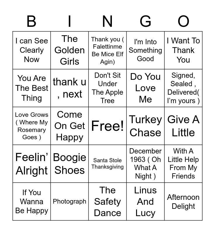 This bingo card has a free space and 67 words: GREENS BEANS POTATOES, ( Do THe) Mashed Potatoes, Thanksgiving Theme, With A Little Help From My Friends, Apple, Peaches , Pumpkin Pie, Cheeseburger In Paradise, The Golden Girls, We Are Family, Don't Sit Under The Apple Tree, Lets Turkey Trot, Santa Stole Thanksgiving, What A Wonderful World, Give A Little, I Want To Thank You, Memories, You Are The Best Thing, Come On Get Happy, I can See Clearly Now, Good Day Sunshine, Do You Love Me, Boogie Shoes, Feelin’ Alright, I'm Into Something Good, Linus And Lucy, Me And Julio Down By The Schoolyard, I Got You Babe, Kokomo, Cecilia, Signed, Sealed , Delivered( I’m yours ), You Make My Dreams ( Come Trues), Afternoon Delight, Lean On Me, Ain't No Mountain High Enough, Wouldn't It Be Nice, Where Everybody Knows Your Name, If You Wanna Be Happy, Stretchy Pants, December 1963 ( Oh What A Night ), Love Grows ( Where My Rosemary Goes ), I Feel The Earth Move, I'll Be There For You, thank u , next, Turkey Chase, Lovely Day, You're My Best Friend, Count on Me, Friends In Low Places, Photograph, Bring It On Home to Me, Rich Girl, Thank you ( Falettinme Be Mice Elf Agin), Every Breath You Take, Fly Me To The Moon, You Know Im No Good, For Once In My Life, The Safety Dance, Cake By The Ocean, Jumpin’ Jack Flash, Escape ( The Pina Colada Song ), American Pie, Born To Run, Maybelline, Gratitude, Piano Man, Best Of My Love, Got To Get You Into My Life and Where You Lead.
