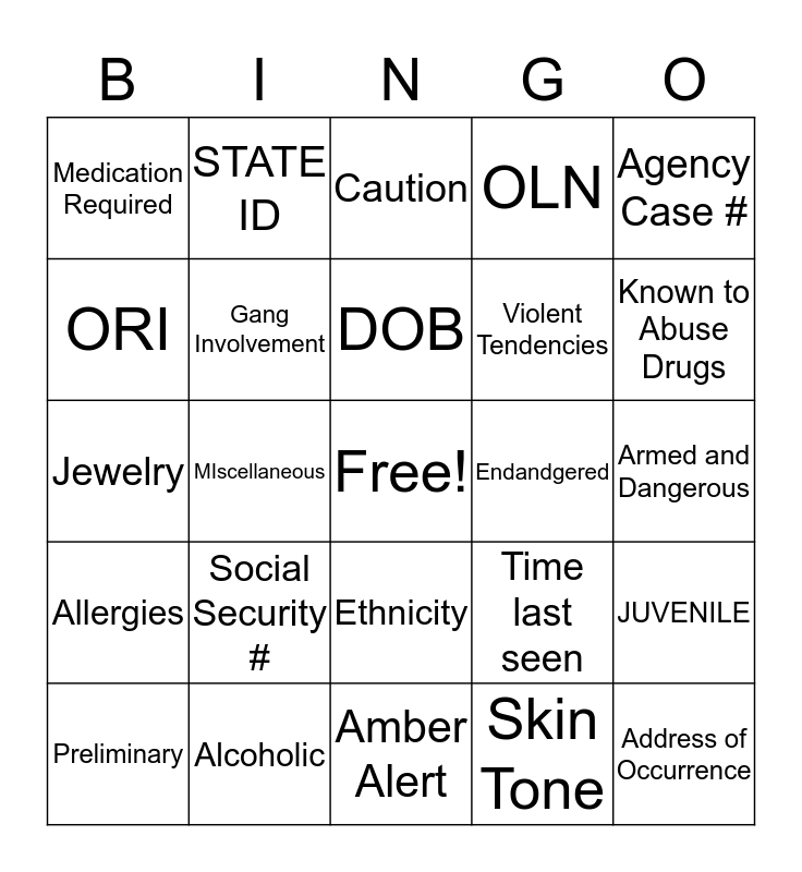 This bingo card has a free space and 29 words: Preliminary, No unusual circumstances, MIscellaneous, Agency Case Number, Medication Required, Caution, Gang Involvement, Social Security #, Endandgered, Alcoholic, Armed and Dangerous, Address of Occurrence, Amber Alert, Skin Tone, Known to Abuse Drugs, SMT, Ethnicity, Allergies, Agency Case #, Jewelry, Time last seen, White, Violent Tendencies, ORI, OLN, STATE ID, JUVENILE, DOB and HAIR COLOR.