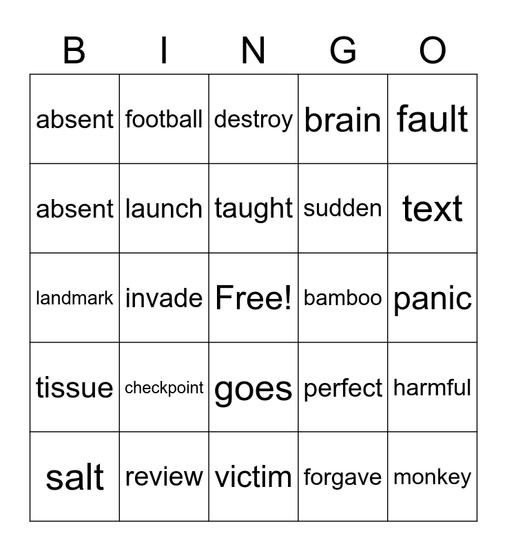 This bingo card has a free space and 34 words: scale, forgave, fume, museum, tissue, launch, fault, salt, football, brought, taught, destroy, replied, return, bamboo, text, review, landmark, checkpoint, perfect, goes, throat, absent, panic, victim, monkey, brain, playful, sudden, absent, regrow, invade, harmful and reptile.