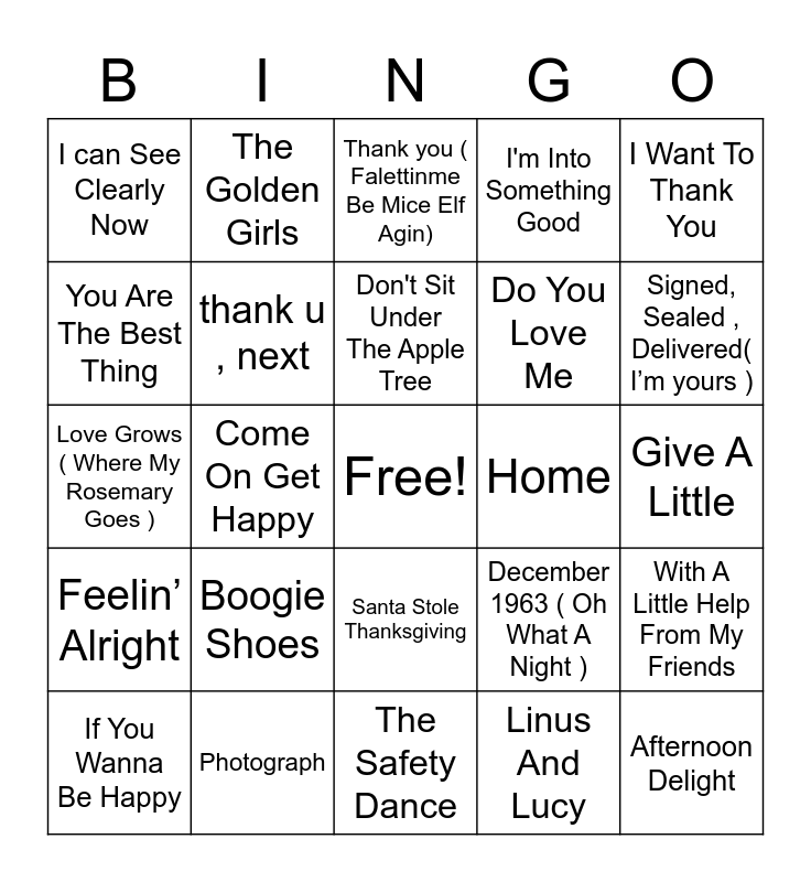 This bingo card has a free space and 67 words: GREENS BEANS POTATOES, ( Do THe) Mashed Potatoes, Thanksgiving Theme, With A Little Help From My Friends, Apple, Peaches , Pumpkin Pie, Cheeseburger In Paradise, The Golden Girls, We Are Family, Don't Sit Under The Apple Tree, Lets Turkey Trot, Santa Stole Thanksgiving, What A Wonderful World, Give A Little, I Want To Thank You, Memories, You Are The Best Thing, Come On Get Happy, I can See Clearly Now, Good Day Sunshine, Do You Love Me, Boogie Shoes, Feelin’ Alright, I'm Into Something Good, Linus And Lucy, Me And Julio Down By The Schoolyard, I Got You Babe, Kokomo, Cecilia, Signed, Sealed , Delivered( I’m yours ), You Make My Dreams ( Come Trues), Afternoon Delight, Lean On Me, Ain't No Mountain High Enough, Wouldn't It Be Nice, Where Everybody Knows Your Name, If You Wanna Be Happy, Stretchy Pants, December 1963 ( Oh What A Night ), Love Grows ( Where My Rosemary Goes ), I Feel The Earth Move, I'll Be There For You, thank u , next, Home, Turkey Chase, Lovely Day, You're My Best Friend, Friends In Low Places, Photograph, Bring It On Home to Me, Rich Girl, Thank you ( Falettinme Be Mice Elf Agin), Every Breath You Take, Fly Me To The Moon, You Know Im No Good, For Once In My Life, The Safety Dance, Cake By The Ocean, Jumpin’ Jack Flash, Escape ( The Pina Colada Song ), American Pie, Born To Run, Maybelline, Gratitude, Piano Man, Best Of My Love, Got To Get You Into My Life and Where You Lead.