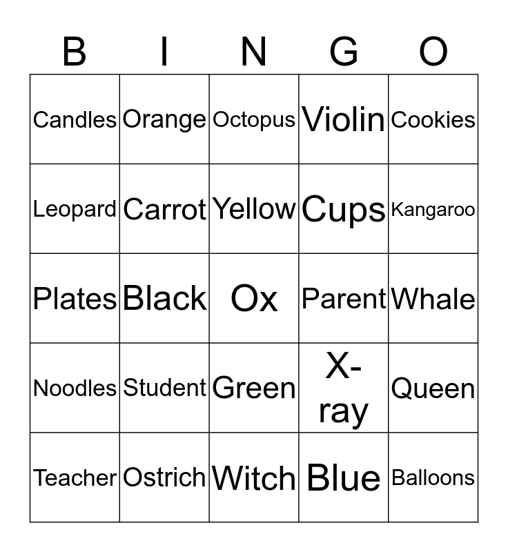 This bingo card has a free space and 24 words: Student, Ostrich, Yellow, Teacher, Cookies, Candles, Leopard, Orange, Parent, Green, Cups, Plates, X-ray, Queen, Carrot, Blue, Whale, Octopus, Kangaroo, Black, Balloons, Noodles, Violin and Witch.