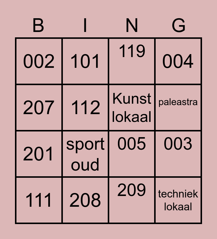 This bingo card has 16 words: 208, 003, 119, 002, 201, 101, 005, 209, 207, 112, 111, 004, sport oud, paleastra, Kunst lokaal and techniek lokaal.