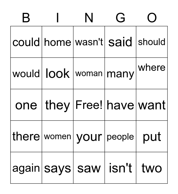 This bingo card has a free space and 24 words: women, says, woman, again, should, could, would, home, have, your, many, one, people, put, look, isn't, want, wasn't, where, they, two, there, said and saw.