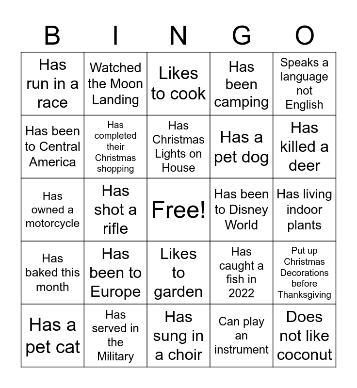 This bingo card has a free space and 24 words: Has been to Europe, Has served in the Military, Has Christmas Lights on House, Has a pet cat, Speaks a language not English, Has run in a race, Has been to Central America, Watched the Moon Landing, Has been to Disney World, Likes to garden, Has a pet dog, Has owned a motorcycle, Has caught a fish in 2022, Put up Christmas Decorations before Thanksgiving, Has completed their Christmas shopping, Can play an instrument, Has living indoor plants, Likes to cook, Has killed a deer, Has shot a rifle, Does not like coconut, Has baked this month, Has been camping and Has sung in a choir.