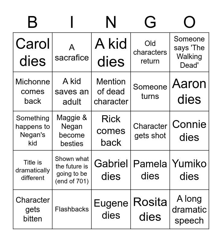 This bingo card has a free space and 24 words: Character gets bitten, Shown what the future is going to be (end of 701), Mention of dead character, Rosita dies, Someone says 'The Walking Dead', Carol dies, A sacrafice, A kid dies, Character gets shot, Connie dies, Something happens to Negan's kid, A kid saves an adult, Pamela dies, Yumiko dies, Michonne comes back, Flashbacks, Eugene dies, Old characters return, Aaron dies, Title is dramatically different, Maggie & Negan become besties, Gabriel dies, Someone turns and A long dramatic speech.