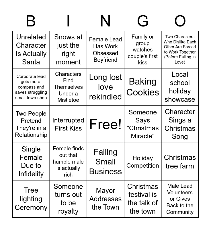 This bingo card has a free space and 29 words: Tree lighting Ceremony, Child Wise Beyond Their Years, Interrupted First Kiss, Caroling, Unrelated Character Is Actually Santa, Female Lead Has Work Obsessed Boyfriend, Characters Find Themselves Under a Mistletoe, Female finds out that humble male is actually rich, Someone Says "Christmas Miracle", Someone turns out to be royalty, Character Sings a Christmas Song, Male Lead Volunteers or Gives Back to the Community, Mayor Addresses the Town, Christmas festival is the talk of the town, Local school holiday showcase, Lead With Big City Career Goes Back to Small Hometown, Failing Small Business, Single Female Due to Infidelity, Two Characters Who Dislike Each Other Are Forced to Work Together (Before Falling in Love), Two People Pretend They're in a Relationship, Holiday Competition, Single Parent Due to Partner Passing Away, Baking Cookies, Corporate lead gets moral compass and saves struggling small town shop, Family or group watches couple's first kiss, Snows at just the right moment, Christmas tree farm, Long lost love rekindled and Child wishes for parent to find love.