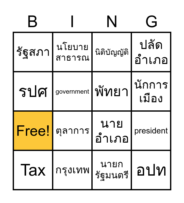 This bingo card has 24 words: สิงห์สักทอง, เอกชน, นายกรัฐมนตรี, อปท, รัฐสภา, นโยบายสาธารณ, พัทยา, ปลัดอำเภอ, Free!, กรุงเทพ, ข้าราชการ, นักการเมือง, สิทธิ, เสรีภาพ, นายอำเภอ, ตำรวจ, Tax, government, public administration, president, รปศ, ตุลาการ, นิติบัญญัติ and บริหาร.