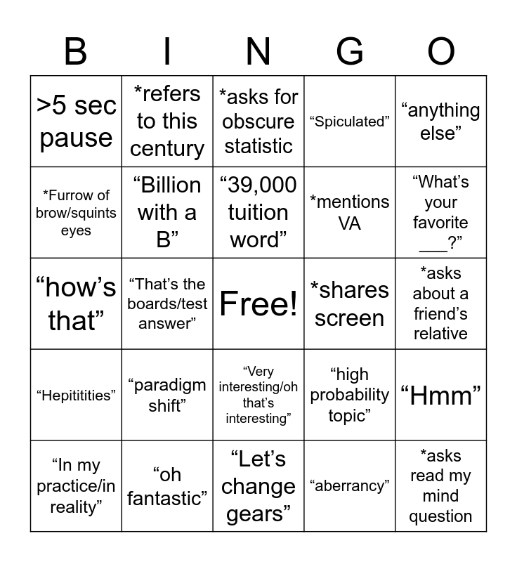 This bingo card has a free space and 26 words: “Very interesting/oh that’s interesting”, “aberrancy”, “39,000 tuition word”, “oh fantastic”, “anything else”, >5 sec pause, *Furrow of brow/squints eyes, *refers to this century, *asks about a friend’s relative, “high probability topic”, *mentions VA, “how’s that”, “Hmm”, “In my practice/in reality”, “That’s the boards/test answer”, *repeats the same thing >3 times, “Spiculated”, “Hepititities”, *asks for obscure statistic, *asks read my mind question, “What’s your favorite ___?”, “Let’s change gears”, *shares screen, “paradigm shift”, “Billion with a B” and *asks a trick questions.