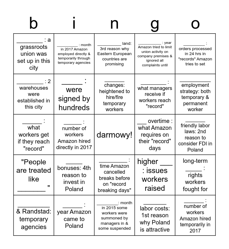 This bingo card has a free space and 24 words: _____ bonuses: 4th reason to invest in Poland, ______ : year Amazon came to Poland, _______ changes: heightened to hire/fire temporary workers, _________ & Randstad: temporary agencies, _________ : orders processed in 24 hrs in "records" Amazon tries to set, ________ : a grassroots union was set up in this city, _________ : 2 warehouses were established in this city, __________ : month in 2017 Amazon employed directly & temporarily through temporary agencies, ___ overtime : what Amazon requires on their "record" days, __________ : time Amazon cancelled breaks before on "record breaking days", _________ : what managers receive if workers reach "record", ______ : what workers get if they reach "record", higher ___ : issues workers raised, long-term _____ : rights workers fought for, _____ : were signed by hundreds, _______ labor costs: 1st reason why Poland is attractive, _______ friendly labor laws: 2nd reason to consider FDI in Poland, __________ land: 3rd reason why Eastern European countries are promising, ___________ employment strategy: both temporary & permanent worker, ______ : number of workers Amazon hired directly in 2017, _______ : number of workers Amazon hired temporarily in 2017, "People are treated like _______ ", ___________ : year Amazon tried to limit union activity on company premises & ignored all complaints until and _________: month in 2015 some workers were summoned by managers in & some suspended.