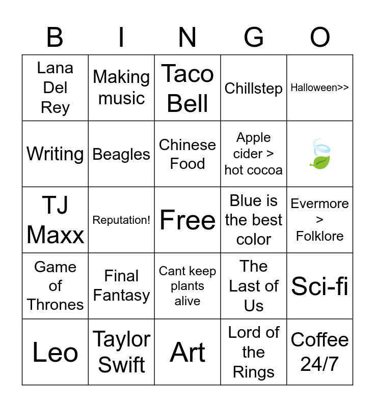 This bingo card has a free space and 24 words: Final Fantasy, Taylor Swift, Chinese Food, Leo, Halloween>>, Lana Del Rey, Writing, Making music, Blue is the best color, Cant keep plants alive, Apple cider > hot cocoa, TJ Maxx, The Last of Us, Sci-fi, Beagles, Lord of the Rings, Evermore > Folklore, Taco Bell, 🍃, Reputation!, Coffee 24/7, Game of Thrones, Chillstep and Art.