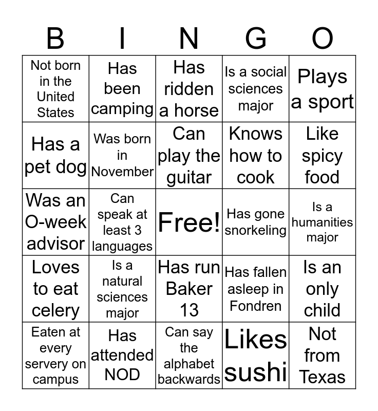 This bingo card has a free space and 24 words: Is a natural sciences major, Has attended NOD, Can play the guitar, Eaten at every servery on campus, Plays a sport, Not born in the United States, Has a pet dog, Has been camping, Has gone snorkeling, Has run Baker 13, Knows how to cook, Was an O-week advisor, Has fallen asleep in Fondren, Is an only child, Was born in November, Likes sushi, Is a humanities major, Has ridden a horse, Like spicy food, Can speak at least 3 languages, Not from Texas, Loves to eat celery, Is a social sciences major and Can say the alphabet backwards.