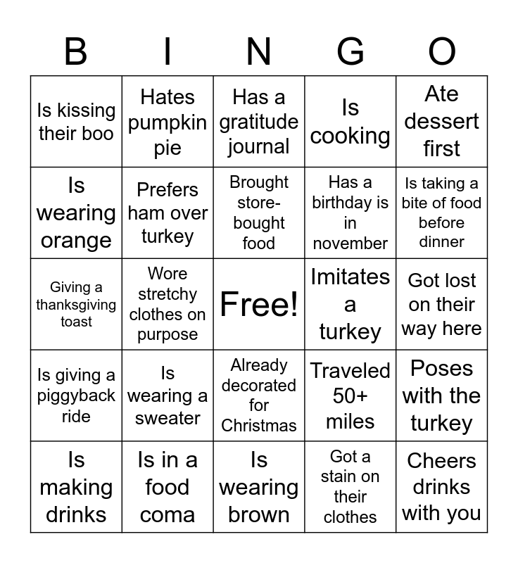 This bingo card has a free space and 27 words: Traveled 50+ miles, Is getting seconds, Has a birthday is in november, Is wearing brown, Is wearing orange, Has a gratitude journal, Hates pumpkin pie, Is giving a piggyback ride, Imitates a turkey, Poses with the turkey, Giving a thanksgiving toast, Is cooking, Is making drinks, Is in a food coma, Is taking a bite of food before dinner, Is singing their heart out, Prefers ham over turkey, Brought store-bought food, Is wearing a sweater, Is kissing their boo, Got lost on their way here, Got a stain on their clothes, Wore stretchy clothes on purpose, Cheers drinks with you, Already decorated for Christmas, Ate dessert first and Draw a hand turkey.
