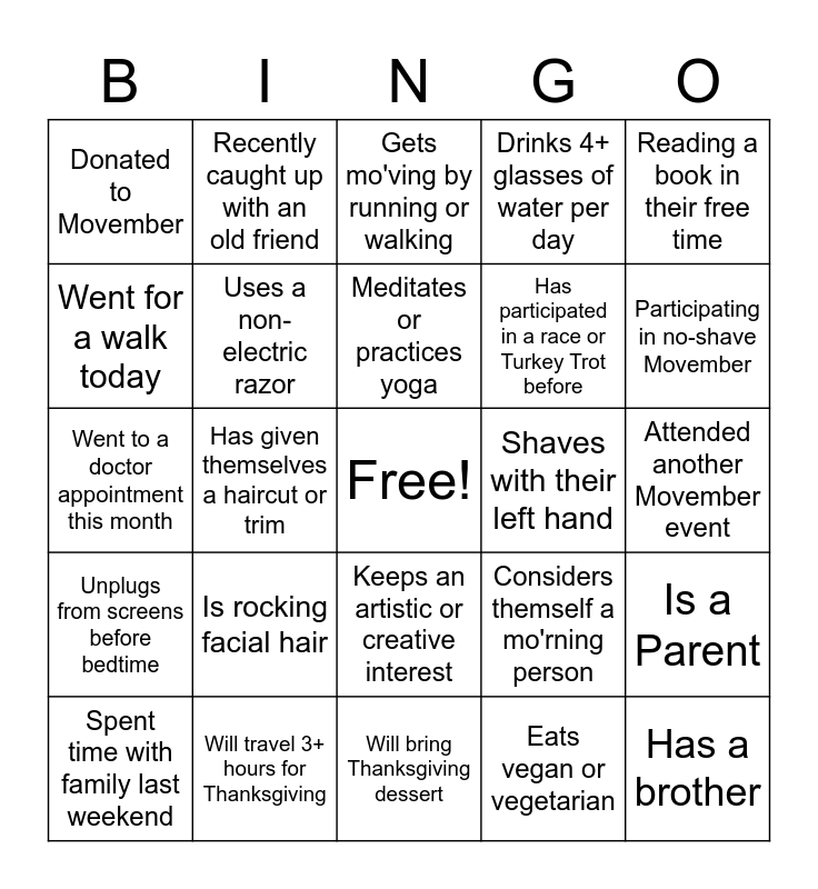 This bingo card has a free space and 24 words: Is rocking facial hair, Will travel 3+ hours for Thanksgiving, Meditates or practices yoga, Spent time with family last weekend, Reading a book in their free time, Donated to Movember, Went for a walk today, Recently caught up with an old friend, Shaves with their left hand, Keeps an artistic or creative interest, Has participated in a race or Turkey Trot before, Went to a doctor appointment this month, Considers themself a mo'rning person, Is a Parent, Uses a non-electric razor, Eats vegan or vegetarian, Attended another Movember event, Gets mo'ving by running or walking, Participating in no-shave Movember, Has given themselves a haircut or trim, Has a brother, Unplugs from screens before bedtime, Drinks 4+ glasses of water per day and Will bring Thanksgiving dessert.