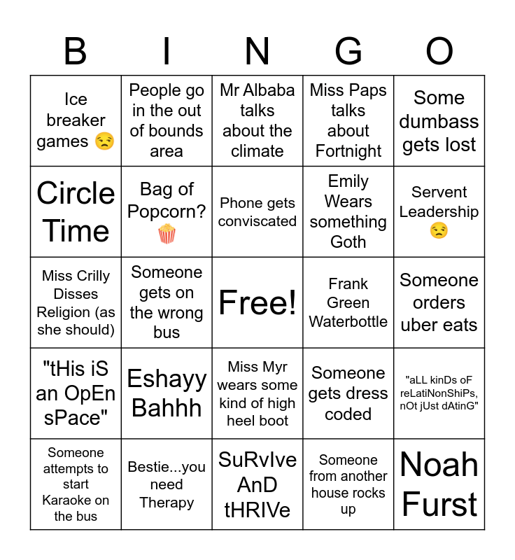 This bingo card has a free space and 24 words: Eshayy Bahhh, Bestie...you need Therapy, Phone gets conviscated, Someone attempts to start Karaoke on the bus, Some dumbass gets lost, Ice breaker games π, Circle Time, People go in the out of bounds area, Frank Green Waterbottle, Miss Myr wears some kind of high heel boot, Emily Wears something Goth, Miss Crilly Disses Religion (as she should), Someone gets dress coded, "aLL kinDs oF reLatiNonShiPs, nOt jUst dAtinG", Bag of Popcorn? πΏ, Someone from another house rocks up, Someone orders uber eats, Mr Albaba talks about the climate, Servent Leadership π, Someone gets on the wrong bus, Noah Furst, "tHis iS an OpEn sPace", Miss Paps talks about Fortnight and SuRvIve AnD tHRIVe.