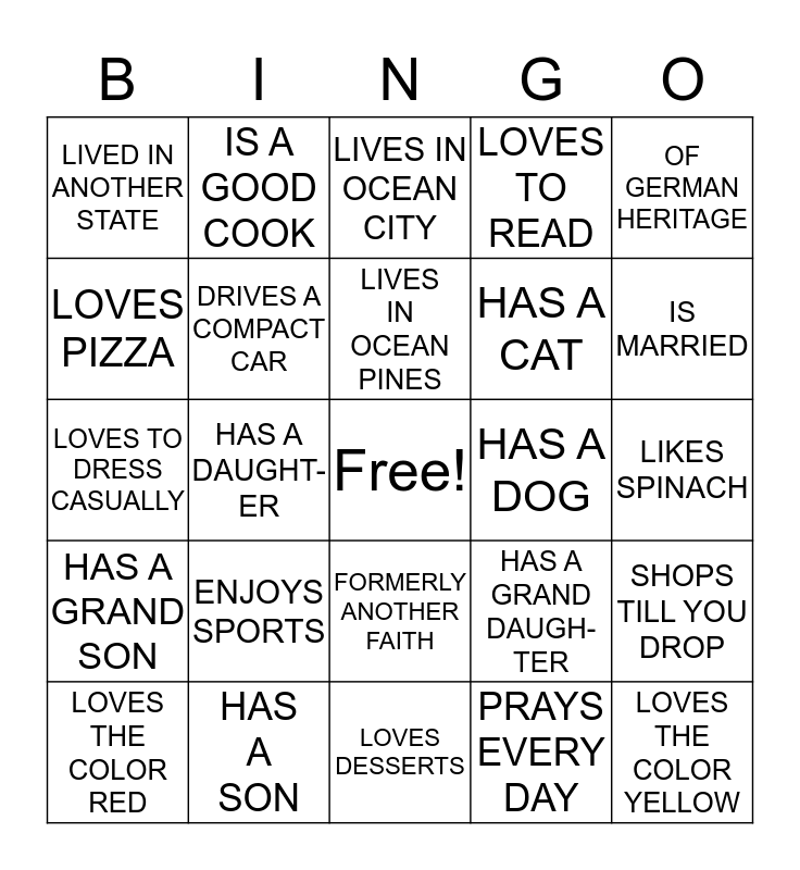 This bingo card has a free space and 24 words: ENJOYS SPORTS, HAS A SON, LIVES IN OCEAN PINES, LOVES THE COLOR RED, OF GERMAN HERITAGE, LIVED IN ANOTHER STATE, LOVES PIZZA, IS A GOOD COOK, HAS A DOG, FORMERLY ANOTHER FAITH, HAS A CAT, LOVES TO DRESS CASUALLY, HAS A GRAND DAUGH- TER, SHOPS TILL YOU DROP, DRIVES A COMPACT CAR, PRAYS EVERY DAY, LIKES SPINACH, LIVES IN OCEAN CITY, IS MARRIED, HAS A DAUGHT- ER, LOVES THE COLOR YELLOW, HAS A GRAND SON, LOVES TO READ and LOVES DESSERTS.