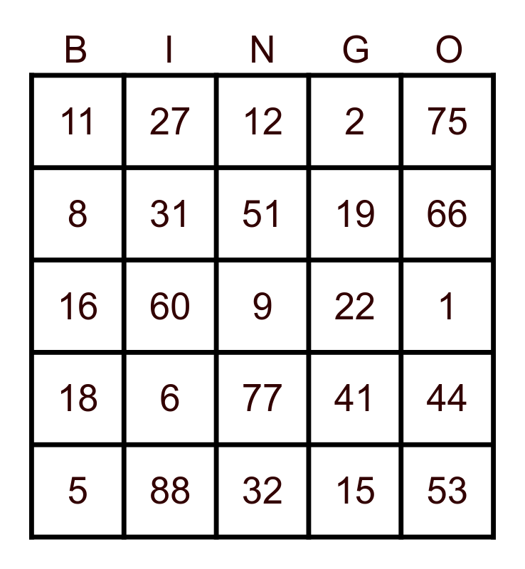 This bingo card has 25 words: 6, 32, 51, 5, 75, 11, 8, 27, 22, 77, 19, 16, 41, 44, 31, 53, 1, 12, 66, 60, 9, 88, 18, 2 and 15.
